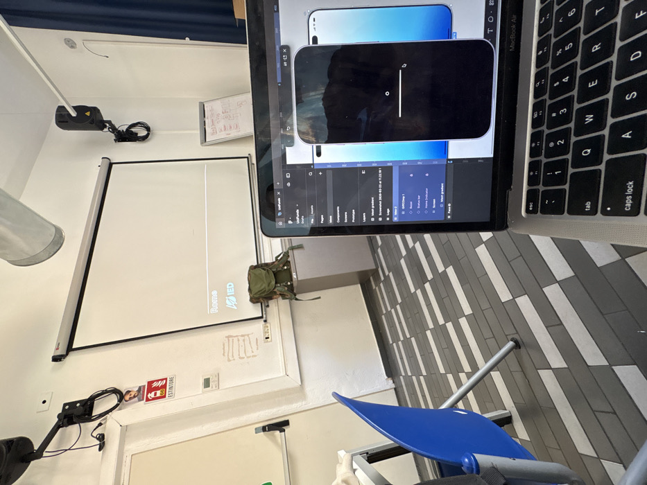 The image depicts an interior scene within a classroom or design studio at an Istituto Europeo di Design (IED) campus, inferred to be in Milan, Italy. The perspective is from the position of a user viewing a silver MacBook Air laptop, which occupies the lower right foreground. The laptop screen displays a UI/UX design software interface, likely Figma, showing a project labeled "UniFunds" and various design elements, including a prominent dark mobile phone mock-up featuring a white horizontal loading bar. In the midground to the left, the back of a bright blue chair with a metal frame is partially visible. The background features a white wall with a central pull-down projection screen. The screen displays the word "Rome" and the "IED" logo in white text. A black projector is mounted on an articulating arm above and to the left of the screen. To the left of the screen, a red "ESTINTORE" (Italian for Fire Extinguisher) sign is affixed to the wall, below which a small control panel is mounted. A dark green backpack with multiple straps rests on a grey rectangular pedestal to the right of the screen. Further right, a white easel with a whiteboard displaying handwritten notes is partially visible, and dark blue curtains are seen along the far right wall. Exposed silver ventilation ducts are visible on the ceiling. The floor is patterned with alternating light grey and dark grey rectangular tiles arranged in a diagonal, staggered configuration. No individuals are present in the frame.