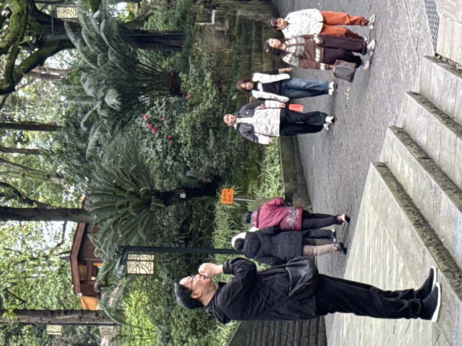 The image depicts an outdoor pathway within a densely vegetated area, specifically in Yuzhong District, China. In the foreground, on the left, a male subject stands on a series of three light-colored stone steps. He wears dark-rimmed glasses, a black hooded jacket, black trousers, and black sneakers with white soles. A black shoulder bag is slung across his body. His right hand is raised towards his mouth, holding a small, light-colored object. On the paved pathway directly behind the male subject and to his right, two individuals walk away from the camera. The leading person wears a dark, possibly black, padded jacket. The trailing person wears a bright pink or maroon patterned jacket. Further along the path, moving towards the camera from the center-right, are four additional individuals. A younger male, wearing a light-grey and black hooded jacket, dark pants, and white sneakers, has his left arm linked with a female. This female wears a white sleeveless puffer vest over a dark long-sleeved top, blue jeans, and light-colored shoes, carrying a red bag in her left hand. To their right, another female walks, wearing a brown patterned cardigan, dark pants, and light-colored shoes, carrying a dark bag. Beside her, a fourth female wears a white long-sleeved shirt, orange pants, and light-colored shoes. The background is dominated by lush green foliage, including numerous tall trees and several prominent palm-like plants (cycads) with broad fronds. Red flowering plants are visible within the greenery on the right side. Two dark ornamental street lamps with patterned, light-colored panels are present, one behind the foreground male and another further back. A small, dark-colored wooden structure with a sloped roof is partially visible nestled among the trees in the upper left. The pathway is paved with grey interlocking stones, bordered by stone retaining walls. An orange rectangular sign with dark text is affixed to the stone wall on the right.
