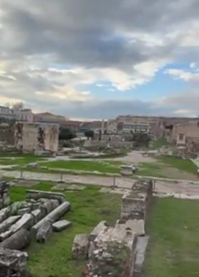 ruins of an ancient site. The foreground features low stone walls and scattered columns, with green grass covering much of the ground. In the background are more ruined walls and structures, including remnants of columns and arches. The sky is overcast with a mix of grey and blue, indicating a cloudy day. There is minimal human activity visible in the scene.