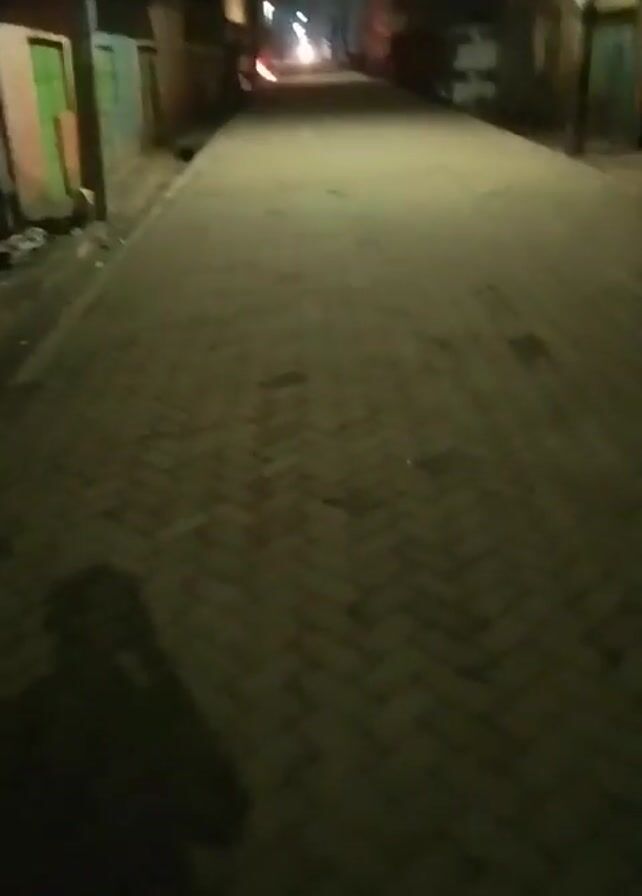 A person walks down a narrow, dimly-lit street at night, casting a long shadow in front