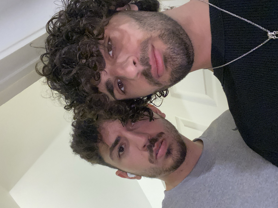 This image is a close-up, upward-angled selfie depicting two adult males indoors. Both individuals possess dark, curly hair and stubble beards. The male on the left wears a light gray t-shirt and a white wireless earbud in his right ear. The male on the right wears a dark, possibly black, ribbed long-sleeved shirt and a silver-colored chain necklace with a small pendant. Their expressions are neutral. The background is a plain, light-colored wall, with a white door frame or architectural molding partially visible on the right. No specific landmarks or contextual details are present to determine a precise location within the city of New York, United States.