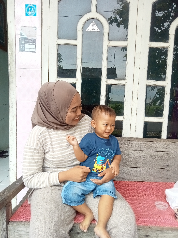 A woman wearing a hijab and striped shirt sits on a wooden bench holding a young child. The child wears a blue shirt and denim shorts. The woman smiles at the child, who is also smiling and holding up a finger. Behind them is a white door with glass panels. A red rug is visible on the bench. A small plastic container sits to the right.