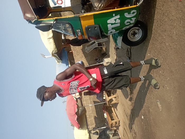 The image captures an outdoor scene in Rafin Bauna, Nigeria, under a clear, bright sky. A dark-skinned male, appearing to be in his twenties, stands in the foreground, facing left with his head tilted slightly upward. He wears a black baseball cap worn backward, a red Chicago Bulls basketball jersey with the number "1" on the front, black cargo shorts, black socks with a white checkerboard pattern at the ankles, and olive green slide sandals. A gold-colored wristwatch is on his left wrist, and his left hand rests near his hip. In the mid-ground, to the right, a green and yellow three-wheeled motorized rickshaw, commonly known as a Keke Napep, is parked. The vehicle displays "PTA-1826" in white lettering on its side. A person wearing a dark shirt and a fedora-style hat is partially visible standing near the Keke Napep, obscured by a beige awning and a brick wall. Further in the background, a series of market stalls or vendor setups are visible, characterized by low brick structures, a red umbrella, and additional beige awnings. Another individual is seated at a low wooden table with small stools under the red umbrella on the left side of the frame. The ground is an unpaved, dusty surface, and pronounced shadows indicate strong, overhead sunlight.