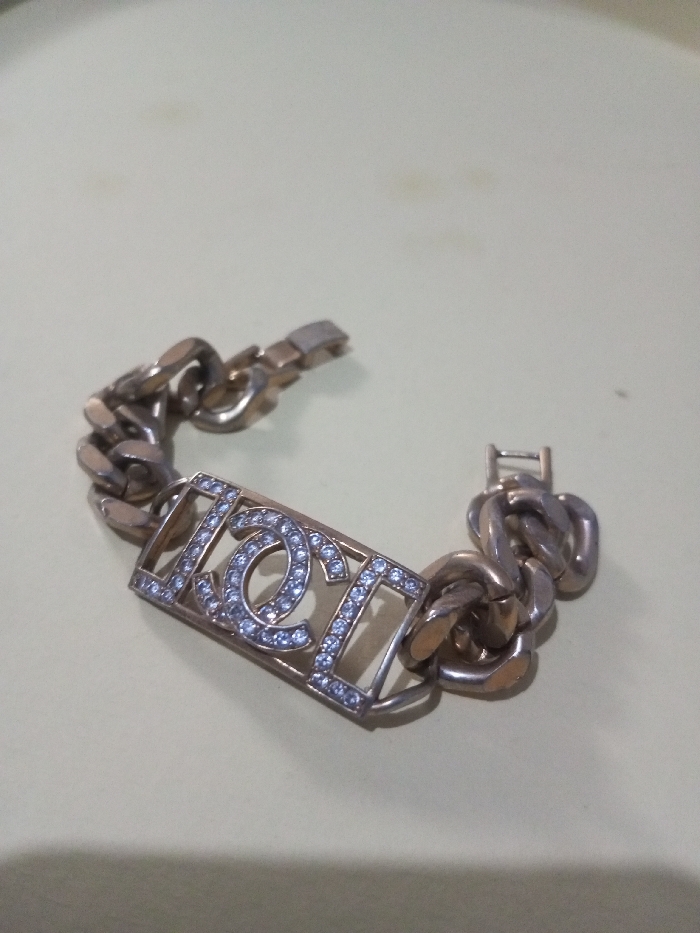 A gold-tone, chunky chain bracelet is showcased. The bracelet features a rectangular centerpiece with the iconic Chanel "CC" logo, embellished with small, sparkling stones. The chain links appear substantial and well-worn, with a slight tarnishing on some areas, adding a vintage appeal. The bracelet clasp is visible, hinting at its functionality. The piece is lying on a plain, light-colored surface, which allows its details to be prominent.