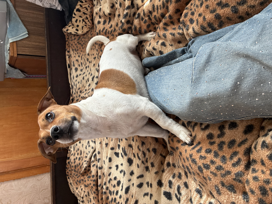 The image depicts an indoor scene in Makiivka, Ukraine, featuring a small, short-haired dog and a human leg. The dog, appearing to be a Jack Russell Terrier, has white fur with light brown patches on its head, ears, and back. It is positioned centrally, sitting on a bed, and is looking upwards and slightly to its left. Its left front paw rests on a human leg. The leg is dressed in light blue denim jeans adorned with numerous small, reflective studs or rhinestones. Both the dog and the leg are on a bed covered by a light brown blanket with a distinct dark brown and black leopard print pattern. In the background, a dark brown wooden headboard or bed frame is visible, behind which a light brown wooden wall or furniture surface appears. To the upper right, a section of a dark wooden cabinet is present, supporting a silver electronic device and folded blue and white textile items.