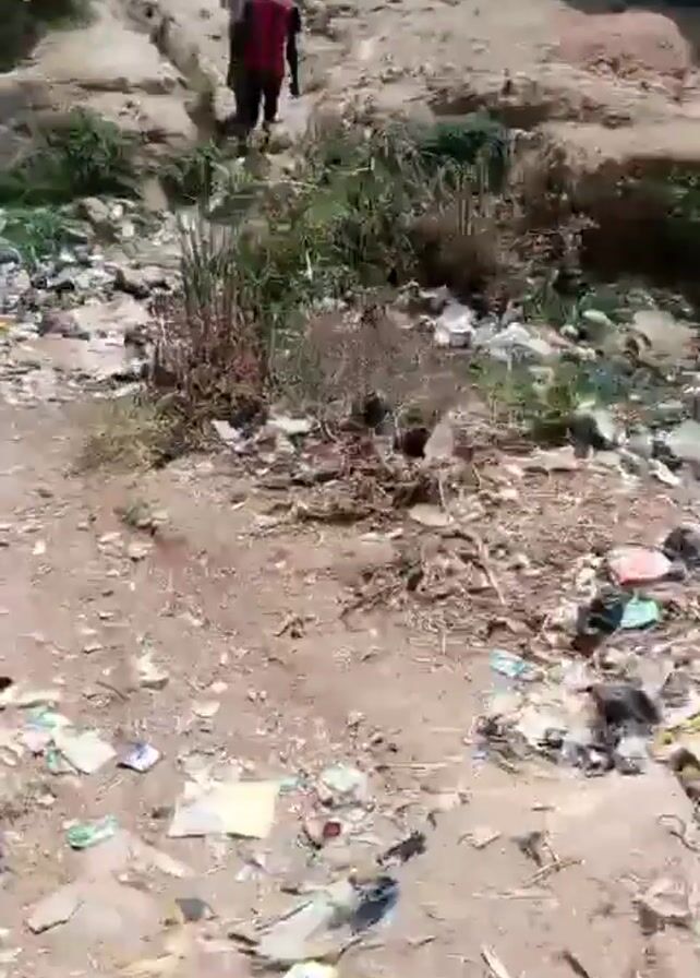 heavily polluted area with trash scattered across the ground and in a small stream