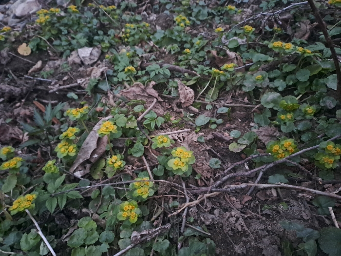 The image displays a close-up, ground-level perspective of a natural, undeveloped area within the city of Spanchevtsi, Bulgaria. The foreground and mid-ground consist of dark brown, uneven soil, largely covered by a dense growth of small green plants. Numerous clusters of chartreuse-yellow flowers are visible, characteristic of wood spurge or a similar species, spread throughout the frame. Interspersed among these flowering plants are other small green leafy ground cover plants, some with rounded foliage. The ground also features scattered organic debris, including several dry, curled brown leaves and multiple dark, slender, bare branches or twigs lying horizontally and diagonally. No individuals, animals, or man-made structures are present within the scene.