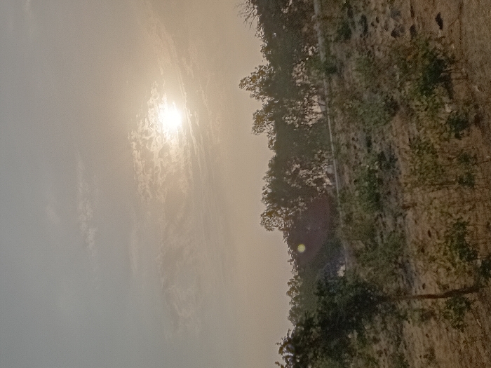 A landscape view features a bright sun obscured by clouds. To the right, a patch of land slopes upwards, covered in sparse vegetation including trees and brush. The overall tone is warm due to the sun's light, yet the atmosphere is hazy. The photograph is oriented vertically, creating an elongated perspective.
