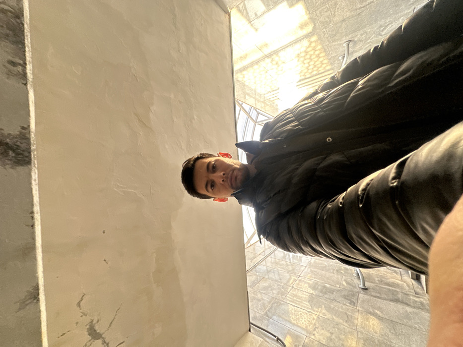 A single male individual, estimated to be between 20 and 35 years old, with short dark hair and a neutral expression, is captured in a low-angle perspective. He wears a dark, puffy winter jacket with a high collar, occupying the central and lower-right portions of the frame. A portion of a hand is visible in the lower-left, indicating a selfie capture. The scene is an underground pedestrian passage located in Tashkent, Uzbekistan. The ceiling above the subject is composed of light-colored, possibly concrete, material exhibiting visible cracks, stains, and general wear. The walls flanking the subject are clad with light grey or beige rectangular tiles, arranged in a grid pattern, and appear textured. On the right wall, a silver-colored metal handrail is mounted horizontally. Bright natural light enters the passage from a skylight or an opening positioned in the upper-right background, casting strong illumination on the tiled walls and creating a backlit effect for the subject.