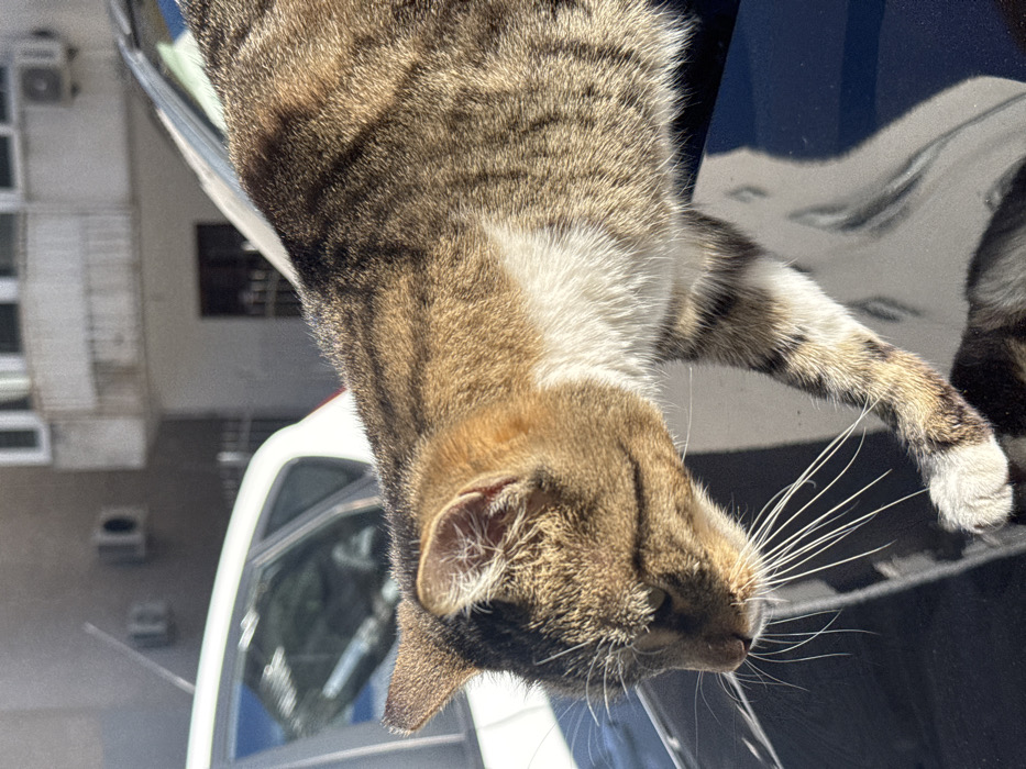 The image depicts a domestic short-haired tabby cat with brown, black, and orange striped fur, a white chest, and white markings on its paws. The cat is positioned on the dark, reflective hood or roof of a parked vehicle, with its head lowered and facing towards the left foreground, indicating a forward motion or intent. Its long white whiskers are prominent. In the midground, a portion of a white car is visible parked behind the dark vehicle. The background features a light-colored, multi-story concrete building with multiple windows, at least one balcony with railings, and two visible exterior air conditioning units mounted on its facade. The scene is illuminated by bright sunlight, characteristic of an urban outdoor environment. While the setting is consistent with a residential or mixed-use area in a city like Budva, Montenegro, no specific street or landmark within Budva can be identified from the visual data. No human subjects are visible.
