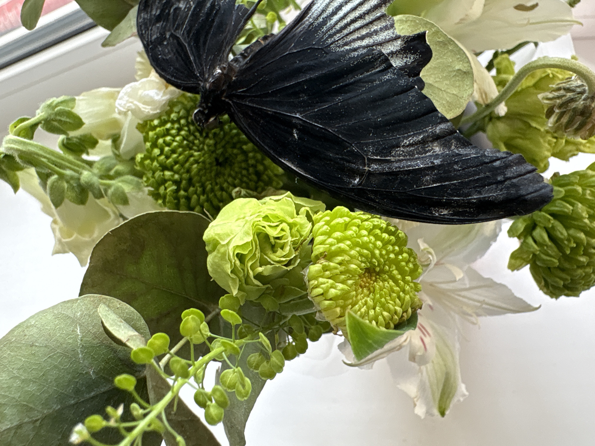 A close-up shot of a floral arrangement featuring a black butterfly perched atop various green and white flowers and foliage. There is a green pompom-like flower, a green rose-like flower, white lily-like flowers, eucalyptus leaves and small green berries. The background is a plain white surface, possibly a table or countertop. It's uncertain whether this image was taken in Chaikovsky, Russia without additional information.