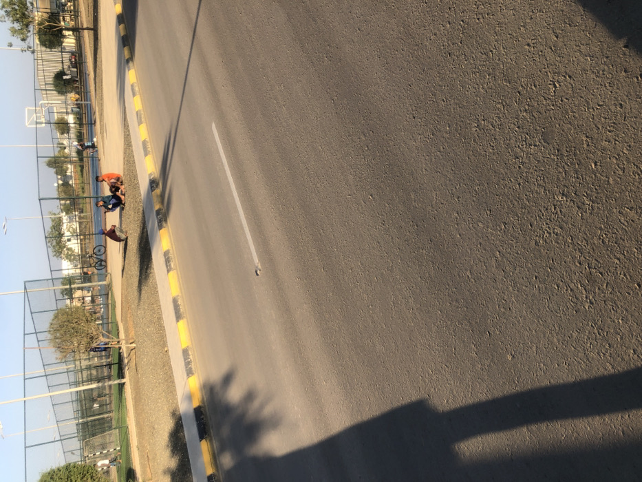 The image depicts an outdoor scene in Hanak, Saudi Arabia, captured from the perspective of an individual standing on an asphalt road. The road, which constitutes the foreground and lower half of the frame, features a single white dashed lane marker and is traversed by the prominent, elongated shadow of a person, indicative of a low sun angle. A curb with alternating yellow and black stripes delineates the road from an elevated, unpaved area composed of dirt and gravel. In the midground, on this unpaved strip, three young males are present. One individual, wearing a dark red shirt and dark pants, is crouched. Adjacent to him, two other males are seated on the ground: one in a dark blue shirt and light-colored pants, appearing to interact with a mobile phone, and another in an orange shirt and dark pants. A black bicycle stands upright near this group. Beyond this area, a tall chain-link fence encloses a sports complex. Inside the fenced perimeter, a green artificial turf field, consistent with a soccer pitch, is visible with at least one white goal structure. Several additional individuals are discernible on the field, engaged in activity. Further into the background, a basketball hoop with a backboard is identifiable. The distant background features several light poles, sparse vegetation, and indistinct building structures under a clear, light blue sky.