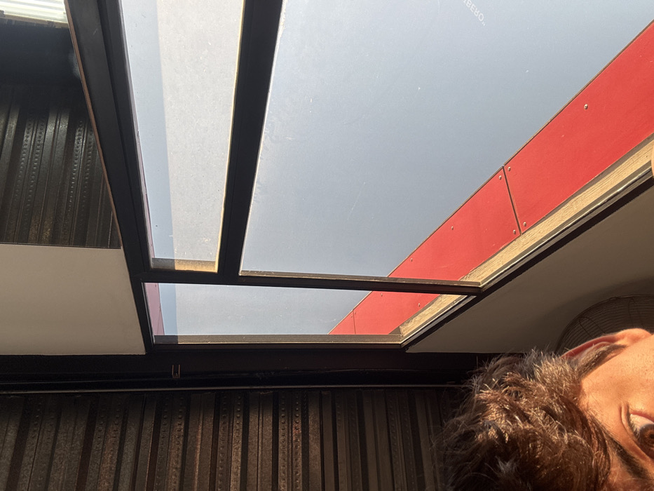 The image captures a partial upward-angled view from an interior space in San Bernardino Tlaxcalancingo, Mexico, looking out through a window. In the lower-left foreground, the upper portion of a person's face is visible, specifically the right eye, eyebrow, and brown hair, illuminated by direct sunlight. A partial view of a white electric fan is situated below the person's eye. To the left of the person is a dark, vertically oriented corrugated metal wall. A multi-pane window with dark frames occupies the central and right portions of the frame. Through the window, an exterior scene is visible. A bright red horizontal band, composed of multiple rectangular panels with visible fasteners, runs across the lower exterior view. Above this red band is a light blue, flat surface, likely a building wall, on which faint, mirrored text, possibly "BO", is discernible. Strong sunlight illuminates the exterior elements and creates highlights on the person's hair.