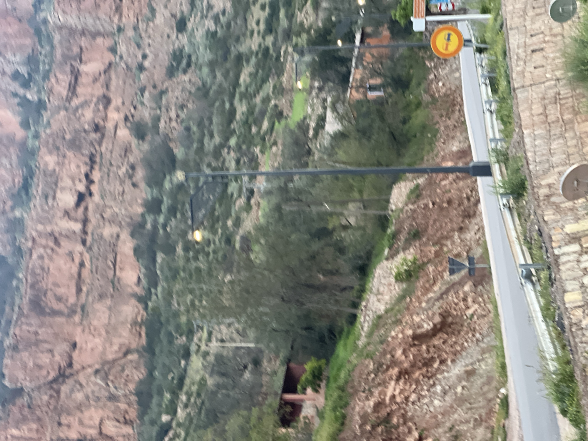 steep, rugged terrain, possibly a hillside or mountain, in Bin El Ouidane, Morocco. A road runs along the base of the terrain, with streetlights and guardrails visible. There is lush greenery and trees amidst the rocky landscape. A circular yellow road sign is seen near the top of the road. The architecture shows stone or brick wall structures on the right. There are no visible people or identifiable actions or interactions in the scene.