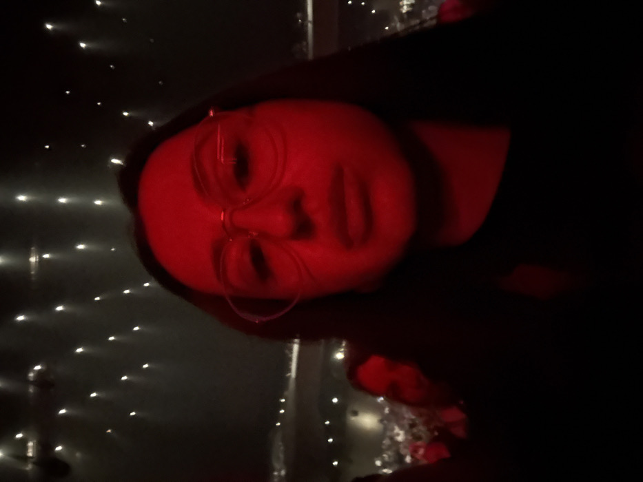 A medium-close-up selfie depicts a young female subject in a dimly lit indoor venue, her face prominently illuminated by intense red lighting