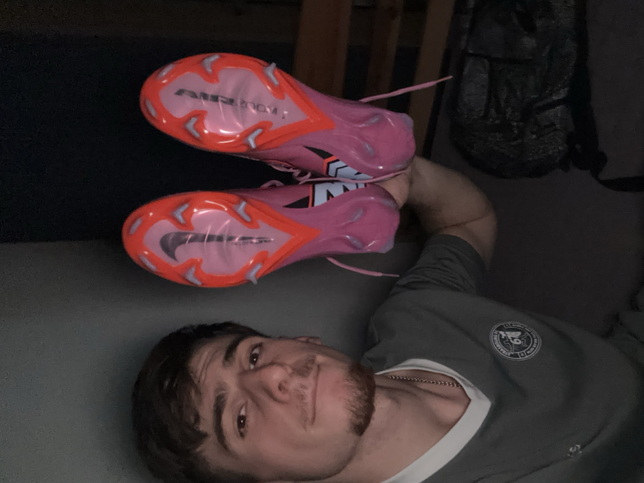 - "A man lies on his back, holding a pair of pink and orange Nike Vapor Edge Speed 360 cleats above him" by FM-DELcs2, licensed under CC BY 4.0
