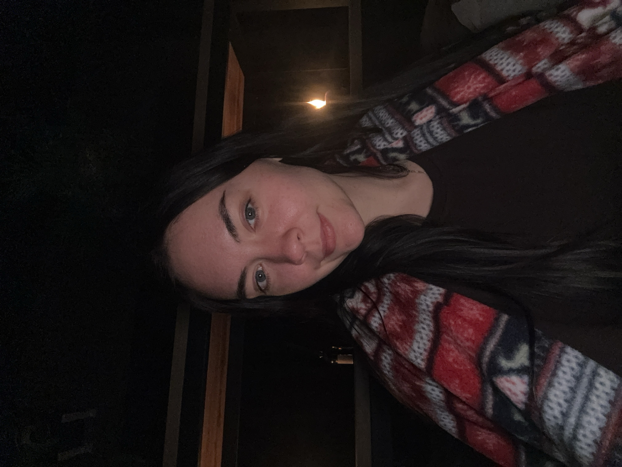 A medium shot photograph depicts a woman with fair skin and dark hair