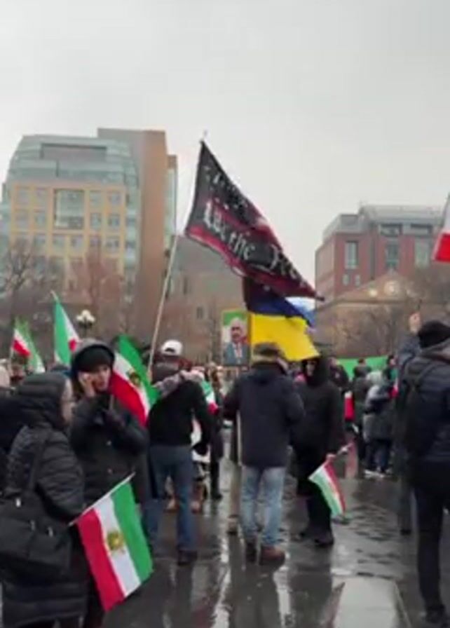 crowd of people gathered in what appears to be a public square or park. They are holding various flags, including those of Iran and Ukraine, as well as a black flag with a white inscription resembling "We the People." People are wearing winter clothing, like jackets and hats. The ground is wet, likely from rain or recent snow. The crowd seems to be participating in some sort of demonstration or protest. There are buildings visible in the background, suggesting an urban setting. Some people in the crowd are talking to each other, while others seem to be looking towards a focal point beyond the camera's view.