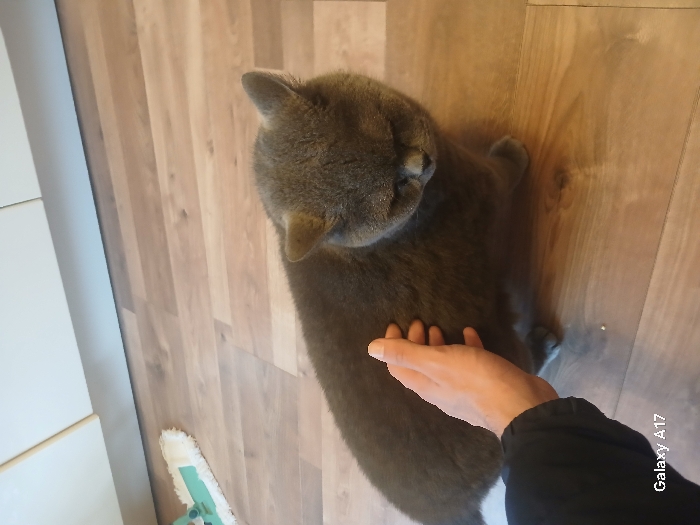 The scene depicts an indoor domestic environment in Frankfurt, Germany, where a grey British Shorthair cat is being petted. The cat is an adult with dense, solid grey fur, positioned on a light brown wood laminate floor. Its head is oriented downwards and slightly to the right, obscuring its eyes. A human hand, with light skin and short fingernails, extends from the lower-left quadrant, stroking the cat's mid-back. The hand is connected to a forearm covered by a dark-colored sleeve. In the upper-left background, a white and green mop head rests on the floor. The upper background features light-colored cabinet fronts or a baseboard. The image contains a "Galaxy A17" watermark in the bottom-left corner.