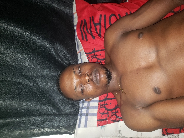 An adult male, appearing of African descent, is depicted lying supine, shirtless, looking directly at the viewer