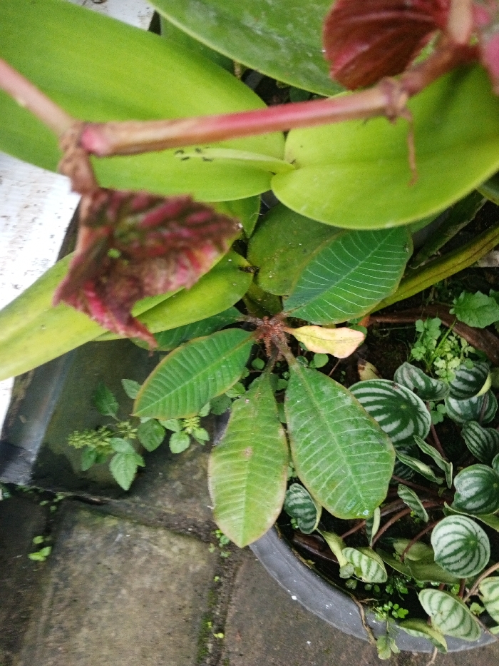 An overhead view depicts a collection of potted plants situated on a concrete tiled surface in Khe Sanh Commune, Vietnam. In the foreground, a blurry, dark red, possibly flowering or leafy plant stem extends diagonally across the upper left. Immediately beneath it, a large, light green leaf displays several small, black ants walking on its surface. Below this, a plant with elongated, medium-green leaves featuring prominent white venation is visible, with some leaves exhibiting yellowish discoloration. This plant is rooted in soil, with a reddish-brown stem visible at its base. To the right, a black plastic pot contains a Peperomia argyreia (Watermelon Peperomia) plant, characterized by its round, dark green leaves with distinct silver-white stripes radiating from the center. Smaller green foliage is also present within the pot and around its base. The concrete surface beneath the plants is segmented by visible lines and appears damp in certain areas, with small patches of moss and sparse green sprouts growing in the crevices. No human figures or discernible actions are present.