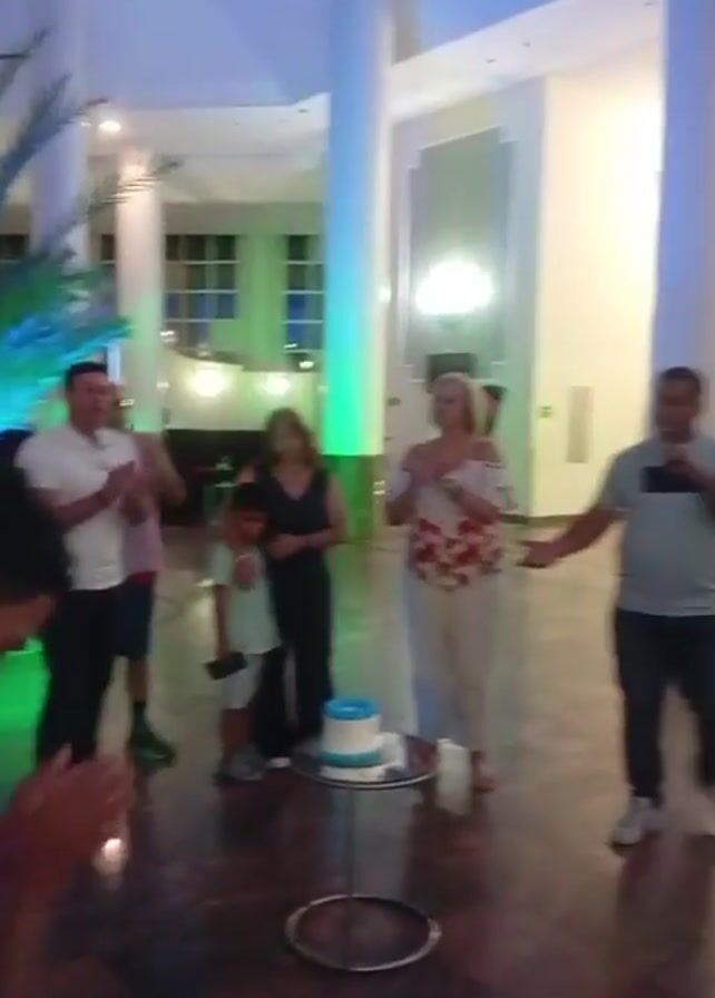 Several people are gathered in a large room, illuminated by blue and white lighting. A cake sits on a small, round table. Most of the adults are clapping their hands and appear to be singing “Happy Birthday”. A few individuals are holding mobile phones. A young child is standing in front of the cake. The room features large columns, dark wood floors, and a high ceiling with decorative accents. Some potted plants and lounge seating are visible in the background.