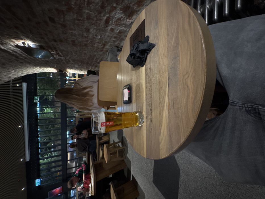 The image displays the interior of a contemporary bar or restaurant, located within the Elektrownia Powiśle complex in Warsaw, Poland. The scene is observed from a first-person perspective, with the photographer's legs, clad in dark grey jeans, visible in the lower foreground. A round, light-colored wooden table occupies the center of the frame. On this table, a tall glass of Żywiec beer, approximately half full, stands prominently. To the right of the beer glass, a black electronic payment terminal with a small, illuminated screen is positioned. Further to the right, a crumpled black item, resembling a napkin or pair of gloves, rests on a dark, possibly leather, menu or coaster. The interior architecture features a blend of historical and modern elements. To the right, an exposed, reddish-brown brick wall with an arched alcove curves into the background, illuminated by a wall-mounted sconce. The ceiling is contemporary, constructed from numerous parallel light-colored wooden slats. In the background, large, dark-framed panoramic windows offer a view of an outdoor evening scene, where trees and distant urban lights are discernible. Inside, multiple patrons are seated at various light-colored wooden tables, furnished with matching stools and chairs. A person with long, light-colored hair, wearing a cream-colored top, is seated at a table directly behind the foreground table, facing away from the camera. To the left, a person in a dark top with green and pink stripes is visible, engaged with their table. Other individuals are present throughout the establishment, engaged in dining and conversation. The flooring is a dark grey material, likely concrete or large tiles. The lighting is ambient and low, creating a warm atmosphere.