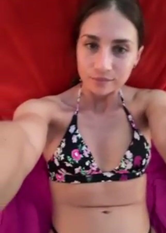 A woman with brown hair pulled back is lying on a red surface with a purple cloth underneath her. She is wearing a black floral bikini. She is looking at the camera, and her face is in focus. The camera is held at an angle above her. Bird sounds can be heard in the background.