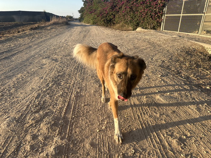 The image depicts a medium-sized dog, predominantly tan and brown with darker facial markings and a bushy, lighter-colored tail, walking on an unpaved dirt road in Beit Yitzhak-Sha'ar Hefer, Israel