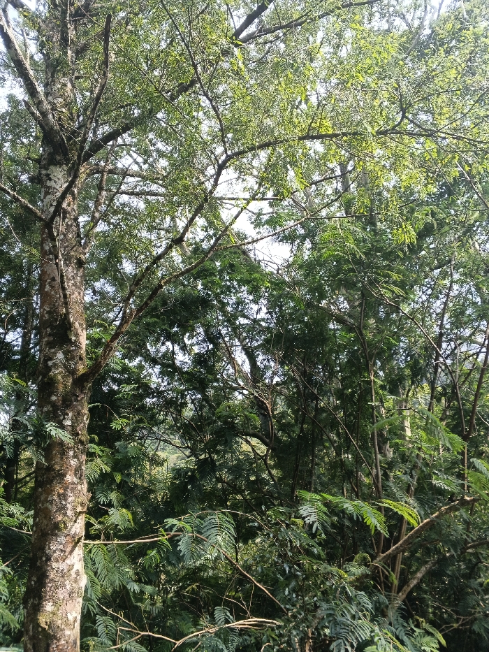 The scene depicts a dense, natural environment, specifically within Lvea Aem District, Cambodia. A large tree trunk, exhibiting mottled bark with light grey and brown patches, is prominently positioned on the left side, extending vertically and branching upwards and to the right. Its branches, some bare and some covered in foliage, interlace with those of numerous other trees and shrubs that comprise the midground and background. The vegetation is characterized by various shades of green, with many leaves displaying a pinnate or fern-like structure. Sunlight filters from above, illuminating the upper canopy and creating bright green highlights on leaves, contrasting with areas of deeper shade. The sky is visible in fragmented patches through the overhead foliage, indicating an outdoor, daylight setting. No individuals, artificial structures, or objects of human origin are present. The overall environment is a verdant, undisturbed wooded area.