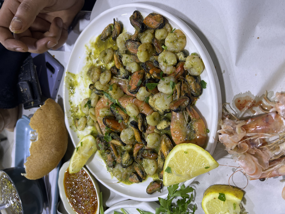 A plate of seafood is served with peeled shrimp shells scattered beside it. The dish includes mussels, prawns, small shrimp, and lemon wedges, all coated in a green sauce and garnished with parsley. A side of sauce and a half-eaten piece of bread are also present. A person's hand and phone are visible, suggesting someone is in the process of eating the meal.
