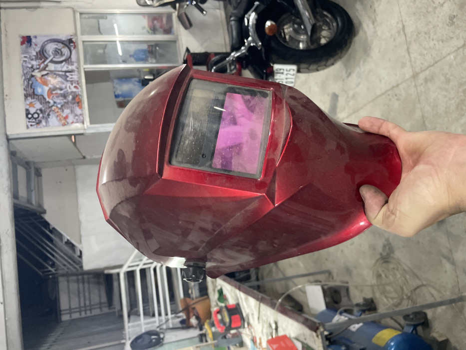 The scene depicts an interior view of a workshop or garage in Nha Trang, Vietnam. In the immediate foreground, a person's right hand, exhibiting smudges consistent with manual labor, holds a dusty, deep red auto-darkening welding helmet. The helmet's rectangular visor displays a purplish tint, indicating a darkened state. To the left of the central subject, a multi-level metal staircase with light-colored railings ascends against a light-toned wall. Below the staircase, a black industrial fan is visible, along with a partially visible workbench or table containing assorted tools, cables, and a red portable container. A blue air compressor tank rests on the floor in the lower-left quadrant. To the right, a dark-colored cruiser-style motorcycle is parked, showing its rear-left side, including chrome exhaust pipes and a dark seat. A license plate, "51-A9 0125," is affixed to its rear fender. Above the motorcycle, on a white wall, a large graphic poster featuring a vintage motorcycle and the text "BMX" is displayed. This poster is positioned above a window with vertical framing. The floor throughout the visible area is composed of light-colored tiles. The overall environment suggests an operational and utilitarian workspace.