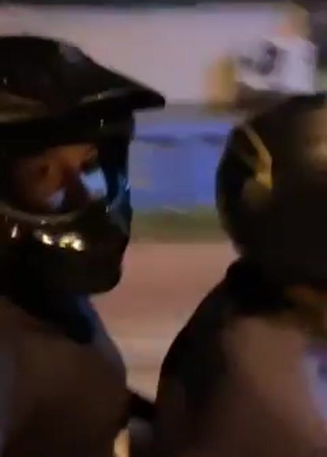 Two people wearing helmets are riding a moped at night. The person in front is wearing a black full-face helmet with a visor and a black face covering. The person in the back is wearing a black helmet with gold accents. They are riding along a street with streetlights and buildings visible in the background.