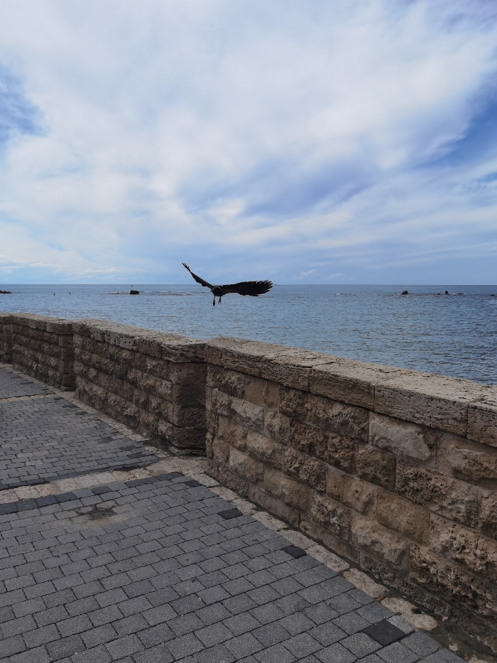 The image presents a coastal scene at Jaffa Port in Tel Aviv-Yafo, Israel. A dark-feathered bird, possibly a crow or similar large species, is captured in mid-descent over the Mediterranean Sea, its wings fully extended and legs lowered. The foreground features a pedestrian walkway paved with dark gray rectangular interlocking pavers, exhibiting some discoloration and wear. To the right of the walkway, a robust stone wall, constructed from irregularly cut, light brown blocks, separates the walkway from the sea. The wall shows signs of age and weathering, with segmented architectural features. Beyond the wall, the calm, blue-gray waters of the Mediterranean Sea extend to the horizon. Several dark, irregular shapes, appearing to be rocks or partially submerged ancient structures, are visible within the sea. The sky above is partly cloudy, displaying a mixture of light blue with scattered white and light gray stratocumulus clouds. No human subjects are present in the scene.
