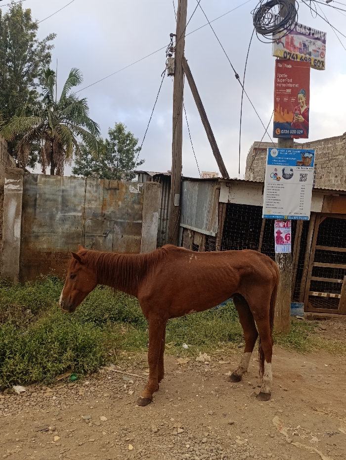 A thin, brown horse stands in a dirt area next to a patch of green vegetation. Behind the horse is a corrugated metal fence and a building with a partially open doorway. Utility poles rise above the structures, displaying advertisements for internet services and gas, along with contact information. A palm tree and other foliage are visible in the background under an overcast sky. The overall scene suggests a rural or underdeveloped urban environment.