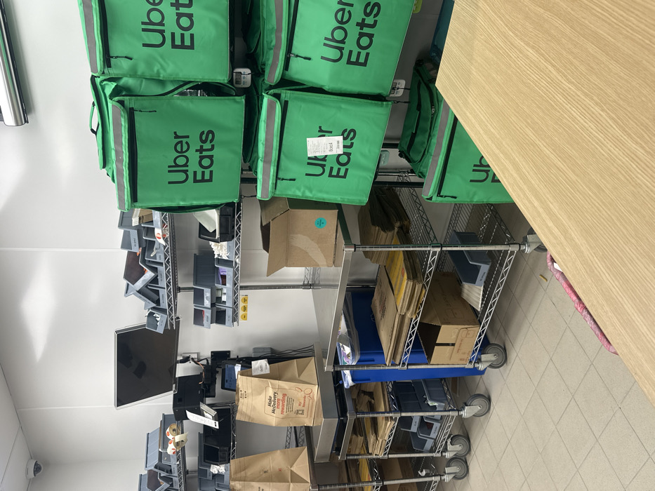 The image displays an indoor commercial staging and storage area, likely within a food service establishment in Chatham, United Kingdom. No individuals are present in the scene. The area features white tiled flooring and white walls. On the left, a mobile stainless steel rolling cart is visible, topped with a digital scale. On the scale, two brown paper bags are placed, one clearly labeled "Make McDelivery rewarding." The cart's lower shelves contain stacks of brown paper bags and multiple grey plastic storage bins. To the left, a second, partially visible rolling cart is also present. Above these carts, a wall-mounted monitor is visible, along with multiple wall-mounted wire shelves holding numerous grey plastic bins containing various items. A white CCTV camera is mounted in the top-left corner. In the center, a fixed stainless steel counter is present. Beneath it, additional wire shelving units are stocked with stacks of brown paper bags, flat cardboard packaging, and grey storage bins. An open brown cardboard box rests on one of these shelves. A blue cylindrical bin is positioned under the counter. The right side of the image is dominated by a vertical array of at least seven bright green Uber Eats insulated delivery bags, each prominently displaying the "Uber Eats" logo. These bags are suspended from a wall-mounted fixture. A white receipt or label is affixed to one of the central Uber Eats bags. A light-colored wooden-patterned countertop occupies the lower right foreground, partially obscuring the base of the delivery bag stack and a portion of the floor.