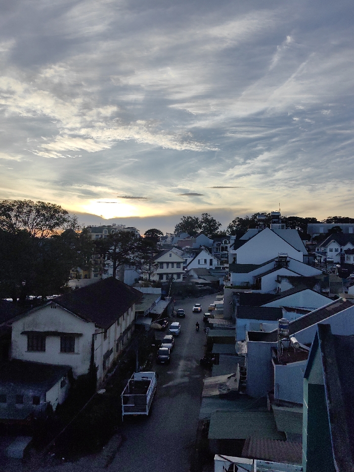 An elevated view captures a town at dusk, under a sky streaked with wispy clouds and a setting sun. Buildings with dark roofs and light walls are clustered together. A street runs through the scene, with parked and moving vehicles. Trees line the horizon, partially obscuring some buildings. The overall atmosphere is one of a quiet, possibly hilly town at the transition between day and night.