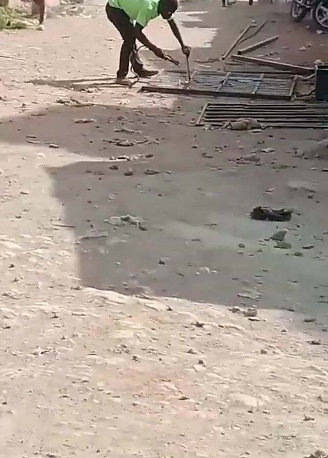 man welding a metal structure on a dirt road in what appears to be a residential or commercial area. The man is wearing a green shirt and dark pants, and he is bending over the metal structure, using a welding tool. The metal structure appears to be a gate or a fence. There are other people walking in the background, and there are buildings on either side of the road. A motorcycle is parked on the right side of the road. The environment appears dusty and somewhat rundown.