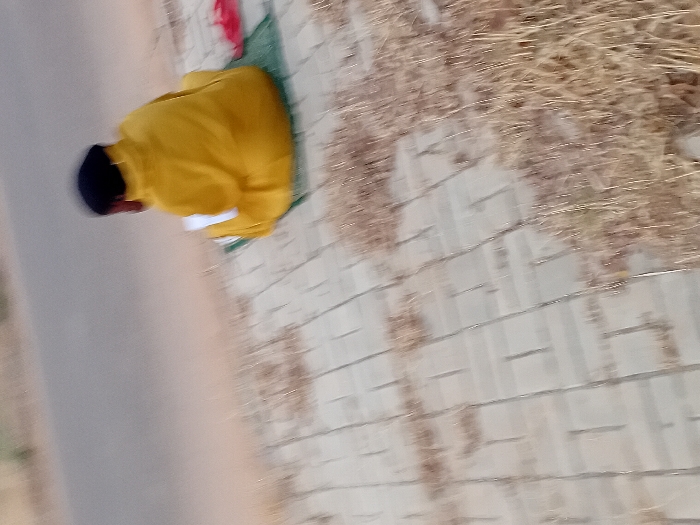 A person wearing a yellow hooded sweatshirt and a black cap is kneeling on a green cloth placed on a paved surface. A red object is visible near the green cloth. To the left is a blurry gray road. To the right, dead grass grows along the edge of the pavement. The image is tilted, with the pavement running diagonally across the frame.
