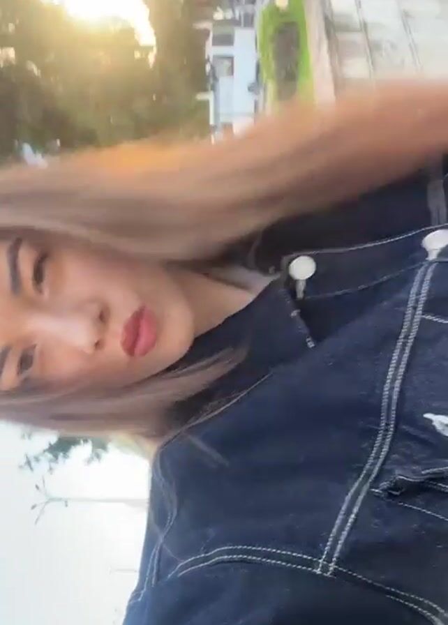 A young woman with long brown hair and pink lipstick is seen from the chest up wearing a dark denim jacket, while outside near a sidewalk. The background contains a building, a white vehicle, green trees, and grass. She appears to be holding a camera in front of her while tilting her head and walking forward.