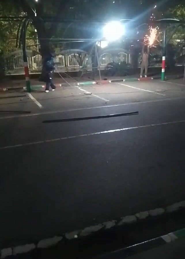 The video depicts an outdoor scene at night, with two individuals present. The setting appears to be a parking lot or open area under some kind of shelter, with a large overhead light illuminating the space. One individual, dressed in darker clothing, is walking across the area. The second individual is standing near the edge of the lot and appears to be using a cutting or grinding tool, as sparks are visible emanating from the device. There is a long black bar lying on the ground in the foreground, across the paved surface. The area is bordered by a curb with red, white, and green markings. Trees are visible in the background, partially obscured by darkness.