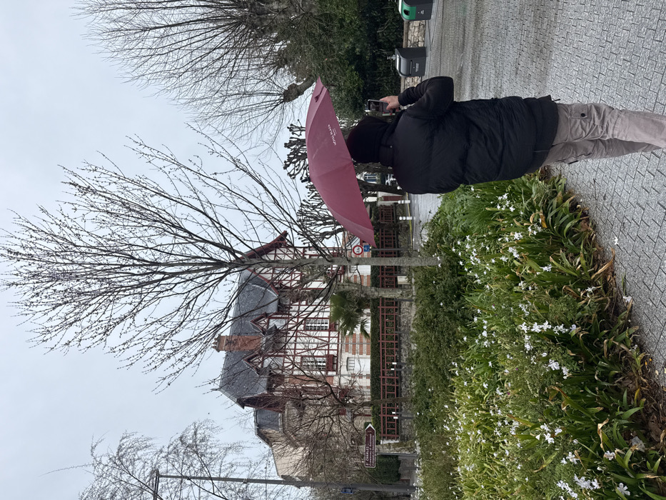 The image depicts an outdoor urban scene in Biarritz, France, on an overcast day. A paved pathway occupies the right side and foreground, running alongside a curving garden bed filled with green foliage and numerous small white flowers. An individual, seen from behind, walks on the pathway holding a maroon umbrella with "HÔTEL PLAZA BIARRITZ" printed in white. The person wears a black hooded puffer jacket, light-colored cargo pants, and holds a dark-colored smartphone horizontally in their right hand, aimed away from the viewer, suggesting they are capturing an image or video. In the midground, beyond the garden bed and pathway, a brown directional signpost points left to "SAINT CHARLES" and down-right to "COMMERCE et RÉSIDENCE." Behind this, a prominent multi-story residential building stands, characterized by a dark grey slate roof with multiple gables and dormer windows, a red brick chimney, and walls featuring white stucco with dark red half-timbering on the upper floors over a lighter brick base. A reddish-brown slatted fence or railing runs along the property line in front of the house, atop a stone wall. Several deciduous trees with bare branches are scattered throughout the scene, including one tall tree centrally located in front of the house and others with pollarded forms to the right. To the far right, two waste bins, one grey and one with a green lid, are visible on the paved area, adjacent to a circular blue sign indicating a height restriction of "3.1m." The sky is uniformly light grey, consistent with overcast weather. The ground appears wet.