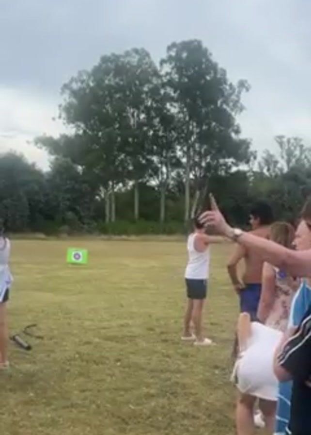 group of people standing on a grassy field near some trees. One man is standing in front of them, aiming an arrow at a target in the distance. The other people are watching him. The sky is overcast.