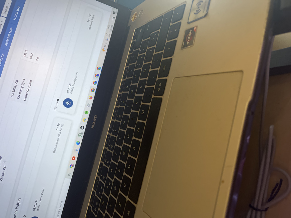 This image captures an angled close-up view of an open HUAWEI laptop computer, situated on a light-colored surface in the city of San José Pinula, Guatemala. The laptop features a silver-toned body, a black QWERTY keyboard with a Spanish layout, and a touchpad. A red and black AMD Ryzen sticker is affixed to the right palm rest, adjacent to a sticker depicting a wireless connectivity icon. The laptop screen displays a web page detailing property information. Visible data points include "Median Home Value" at $376,794, a "Median Home Value Rating" of 5/10, a "Family Friendly Score" of 90/100, and a "Walkable Score" of 29/100. Tax billing details show a Zip code of "44216" and "Owner Occupied: Yes." The location "Clinton, OH" is partially visible on the page. Below the main content, a browser bar displays various application icons such as YouTube, WhatsApp, and Spotify. The system tray in the lower right corner of the screen shows the date "27/10/2023," time "14:27," and a temperature of "17°C." A coiled white cable is partially visible underneath the front edge of the laptop. No individuals or direct interactions are depicted in the scene.