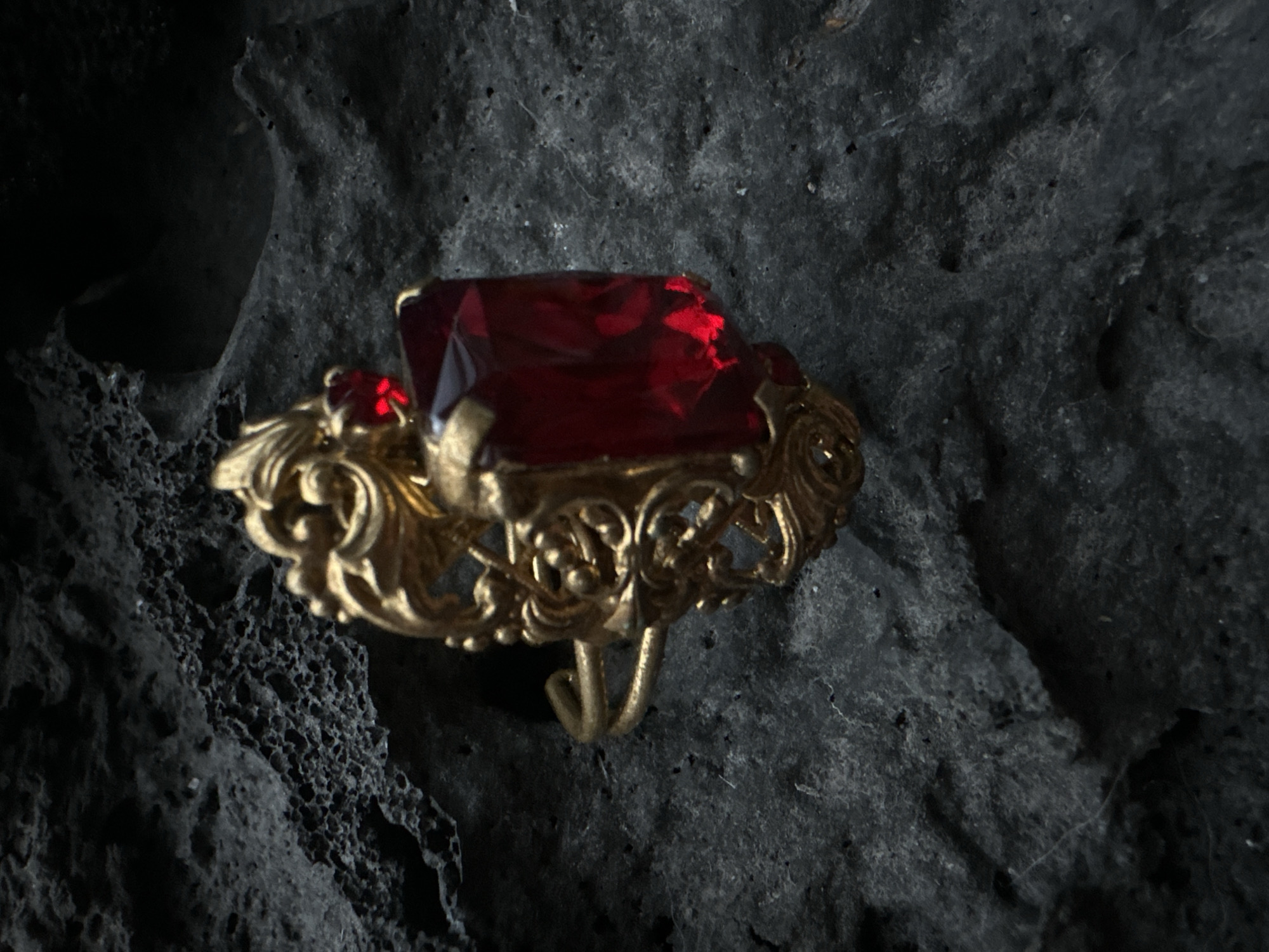 A close-up shot features a large, antique-looking ring with a prominent, rectangular red gemstone. The ring has an ornate gold setting with intricate details and flourishes. It is resting on a textured, dark gray surface that resembles stone or rock. The lighting is low and dramatic, with shadows enhancing the texture of the surface and emphasizing the facets of the gemstone. The image does not provide information that allows to deduce the location of Riga. Latvia.