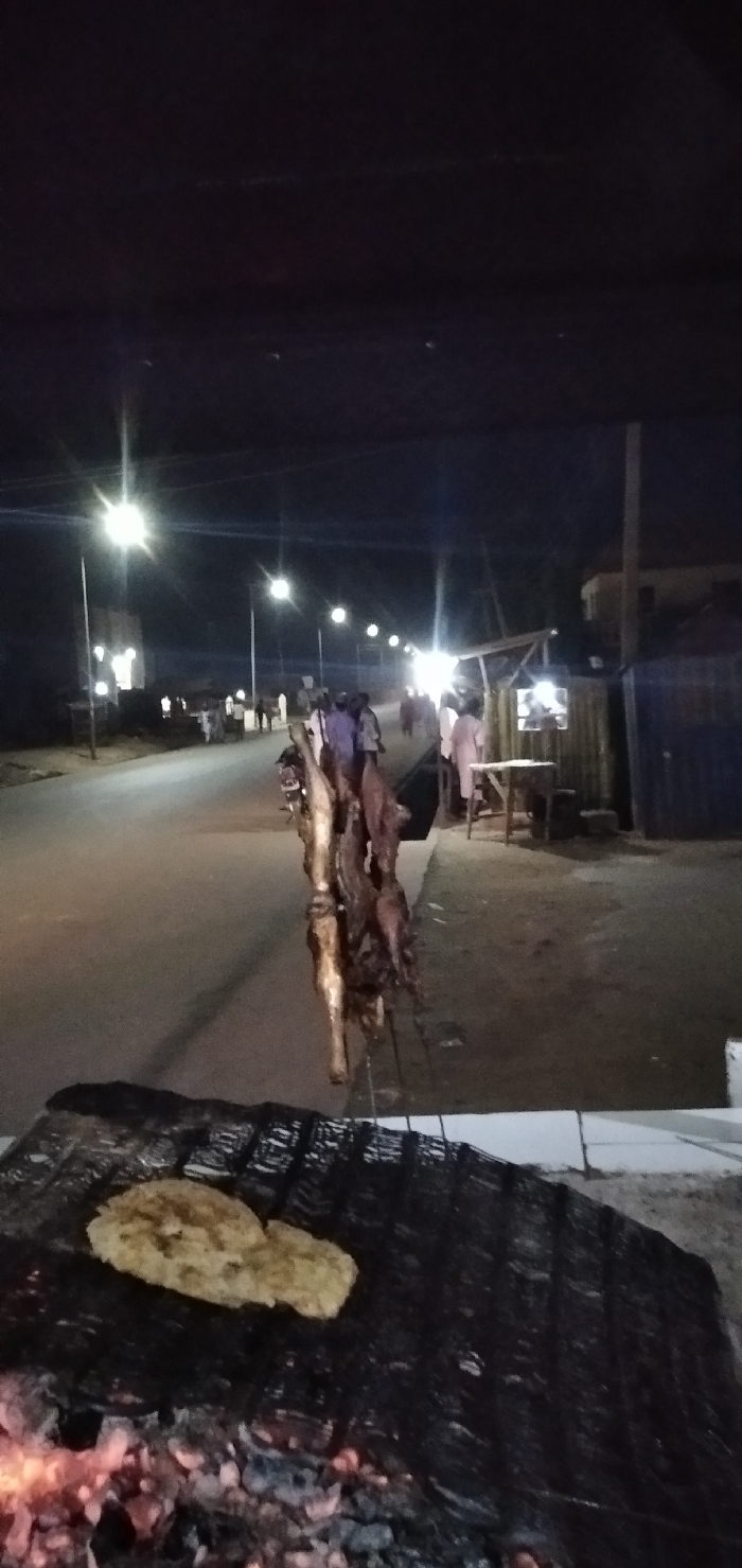 At night, a grill with embers and food sits in the foreground. A rack holds what appears to be roasted meat. In the background, a street is illuminated by streetlights. People stand around a structure resembling a food stall. The scene suggests an outdoor cooking and eating event in an urban setting after dark.