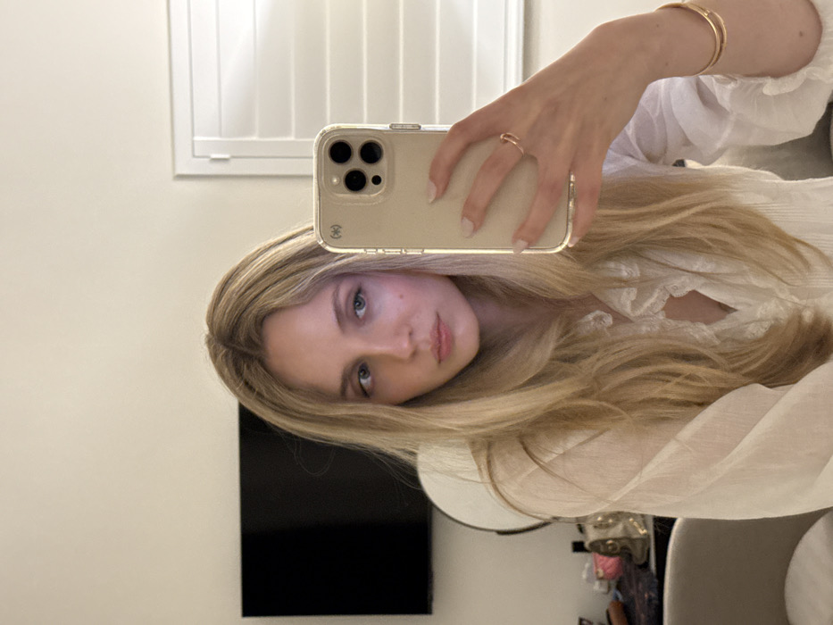 An image depicts a young adult female positioned centrally, capturing a mirror selfie indoors