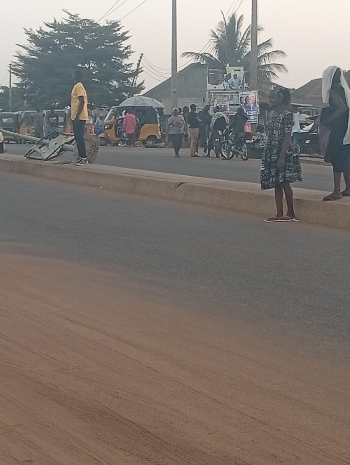 The image depicts an outdoor street scene in Rido, Nigeria, under diffused daylight conditions. The foreground features a reddish-brown dirt shoulder with visible tire tracks, separated by a concrete curb from a two-lane asphalt road. On the left, a broken metallic pole rests partially on the curb and road. A male subject in a yellow t-shirt and dark trousers stands on the curb, facing right. Across the road, a yellow motorized tricycle is central to a group of approximately 10-15 individuals gathered on or near the road. One subject wears a pink garment within this group. To the right, a young female subject in a patterned dress stands on the paved road, facing towards the activity. Further right, another subject with a white head covering and dark attire stands on the road. The background includes utility poles with wires, various trees including a large green specimen and a palm tree, buildings, and a structure displaying multiple political campaign posters. The sky is overcast or hazy.