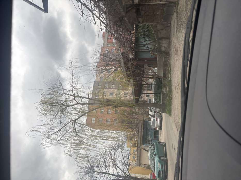 The scene depicts an urban environment in Blagoevgrad, Bulgaria, observed from inside a vehicle, indicated by the visible dashboard and windshield wipers in the lower foreground. The sky is uniformly overcast. A prominent weeping willow tree, displaying sparse light green nascent leaves, occupies the center-left, with additional bare deciduous trees scattered throughout. On the left, a teal-green Ford Focus hatchback, bearing Bulgarian license plate B 2465 AX, is parked on an unpaved road. Behind it, a low-rise building with a blue-paneled section is visible. Further down the road, a silver hatchback is stationary. The background features several multi-story residential buildings exhibiting faded facades in tones of pink, grey, and yellow-orange. To the right, a structure with a covered, bare wooden pergola and adjacent buildings with brown wooden and blue paneling is observed. The ground surface is primarily unpaved earth. No human figures are present.