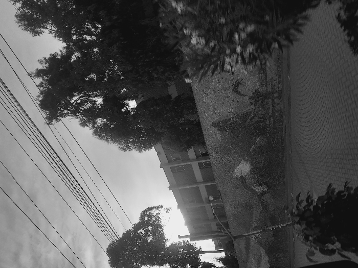 A black and white, tilted perspective showcases power lines stretched across a bright sky, bordered by trees. A tall building stands to the right, its facade facing the viewer. A brick pathway runs along the side, adjacent to a grassy area. The image presents a blend of urban infrastructure and natural elements.
